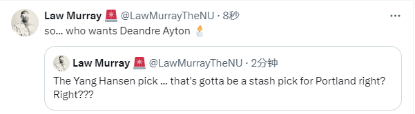 快船队记者Law Murray写道:“这个顺位选杨瀚森,开拓者队这肯定是要把他先‘囤’起来的吧?对吧?”随后该记者又写道:“所以,谁会想要德安德烈-艾顿呢?”
