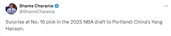 NBA名记Shams表示:“开拓者在第16顺位选中中国球员杨瀚森,这一选择令人意外。”