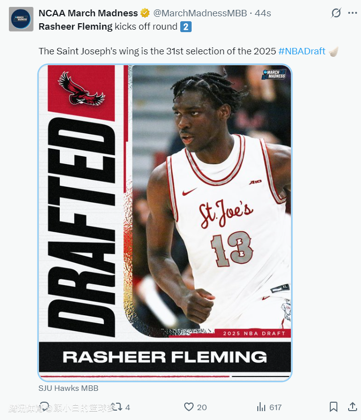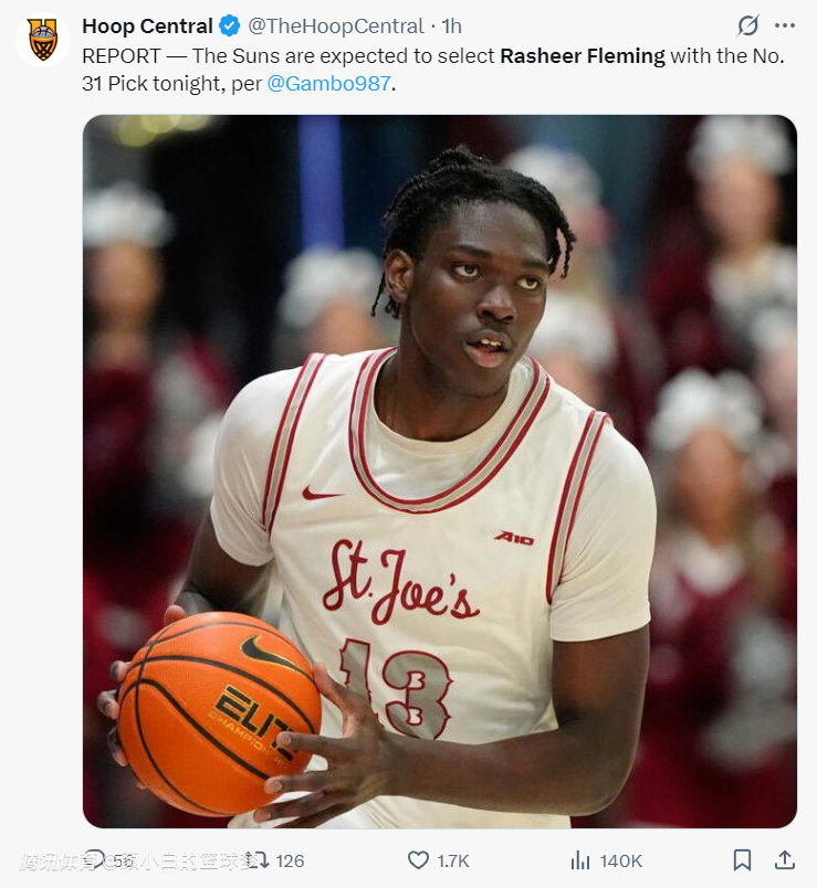 2025-06-27 08:50北京时间6月27日,NBA选秀大会次轮选秀日,太阳队在第31号签选中了来自圣约瑟夫大学的弗莱明。这个签位是太阳用36号签+2个未来次轮签换来的,除此之外太阳还用52号+59号签换了勇士首轮41号签。