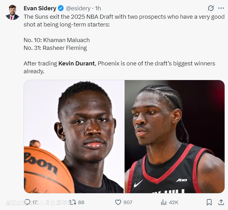 在交易走杜兰特之后,菲尼克斯太阳队已经成为本次选秀大会的最大赢家之一。