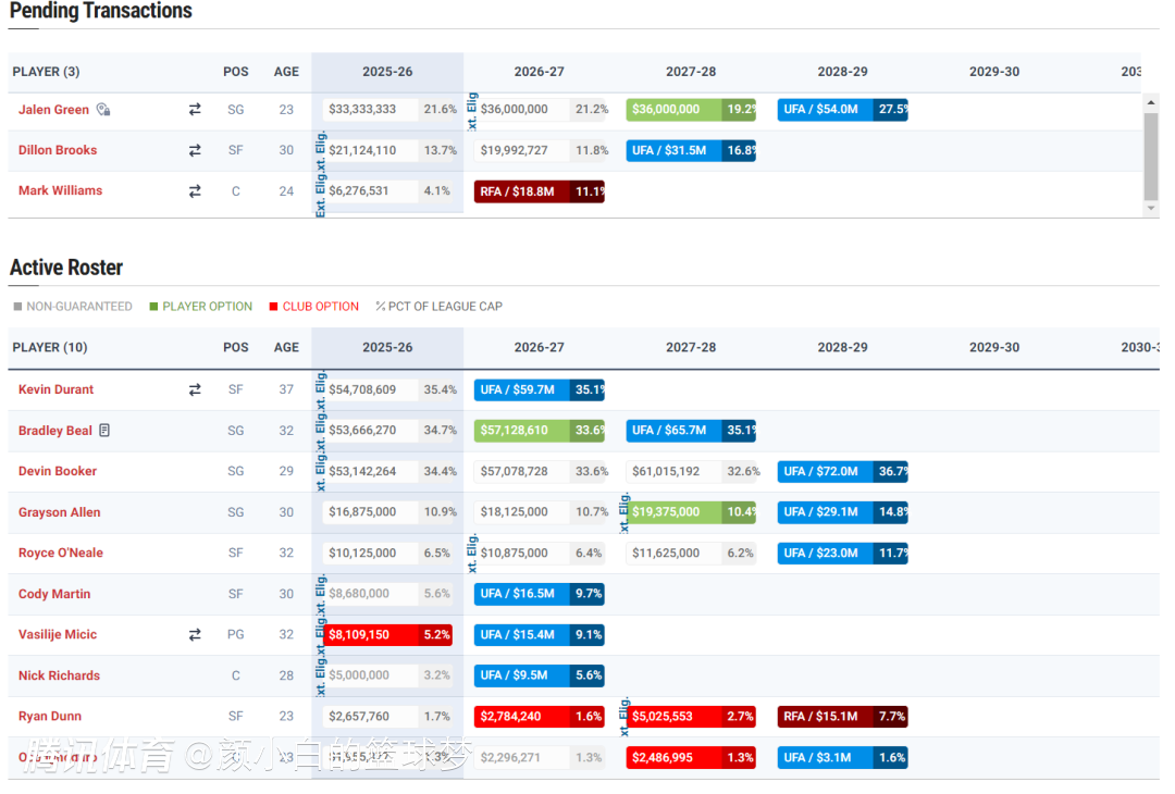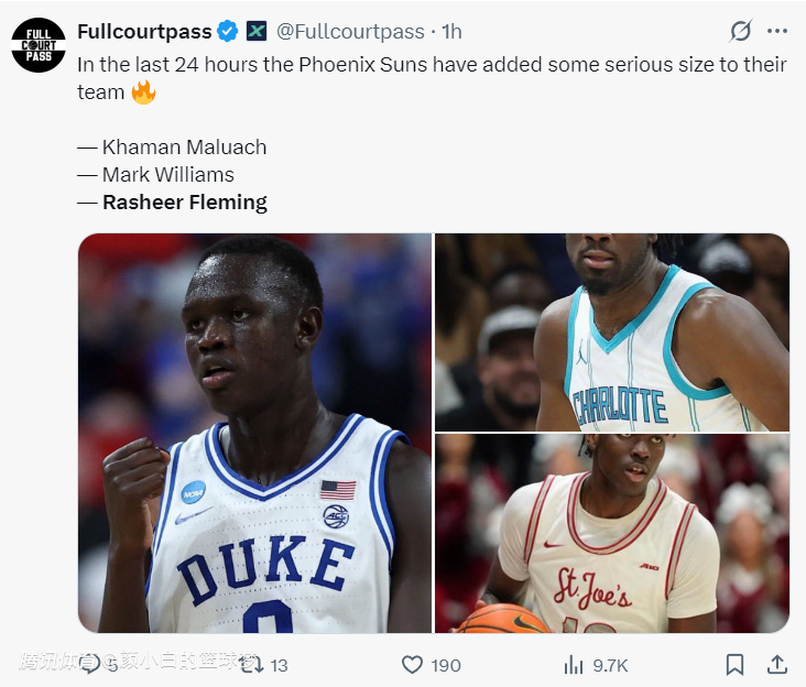 太阳还在首轮选秀大会中交易得到了7尺中锋马克-威廉姆斯,如今太阳一下子补强了三个前场球员,他们的阵容一下就变得充盈起来。(马威是太阳用29号签+2029年首轮签(强烈保护)