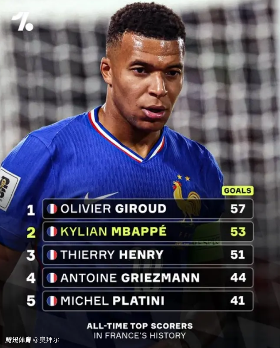 在对阿塞拜疆一战一传一射之后,姆巴佩93次为国家队出场已经打入53球。《马卡报》指出,“在2026年,姆巴佩将冲击两大纪录。”