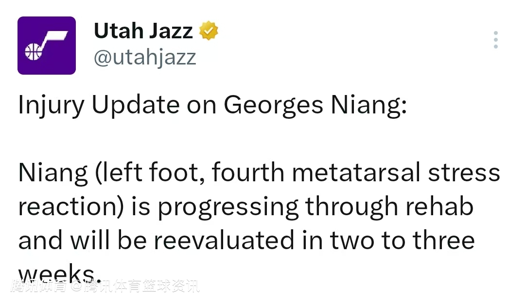 爵士官方:尼昂左脚第四跖骨出现应力性反应 2至3周后接受复查