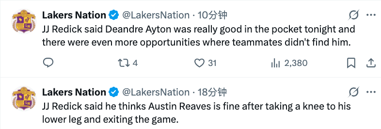 谈及艾顿,雷迪克认为他在低位表现非常出色,还有更多机会队友没能找到他。此役艾顿首发出战26分钟,8投6中,拿到14分8篮板5助攻。