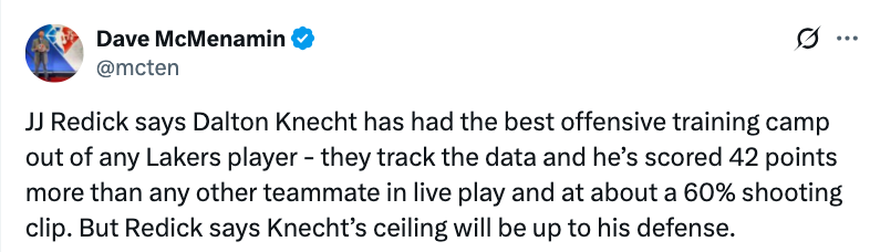 随后,雷迪克也表示,克内克特的上限取决于他在防守端的进步幅度,但在训练营中,他已是球队进攻端表现最好的球员:“他在实战对抗中的得分遥遥领先,得分比其他任何队友都高出42 分,他今晚赢得了进入首发阵容的机会,他的上限将取决于防守。”此役克内克特首发出战33分钟,9投4中,三分球5中2,拿到16分3篮板2助攻。