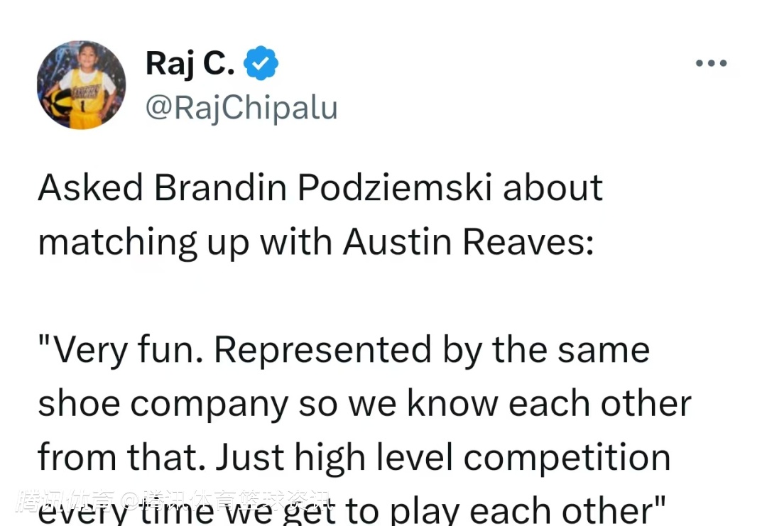 谈及与里夫斯的对位,波杰姆斯基表示:“非常有趣。我们为同一个品牌的球鞋代言(准者),所以从那以后就互相认识了。每次对位都是高水平的较量。”