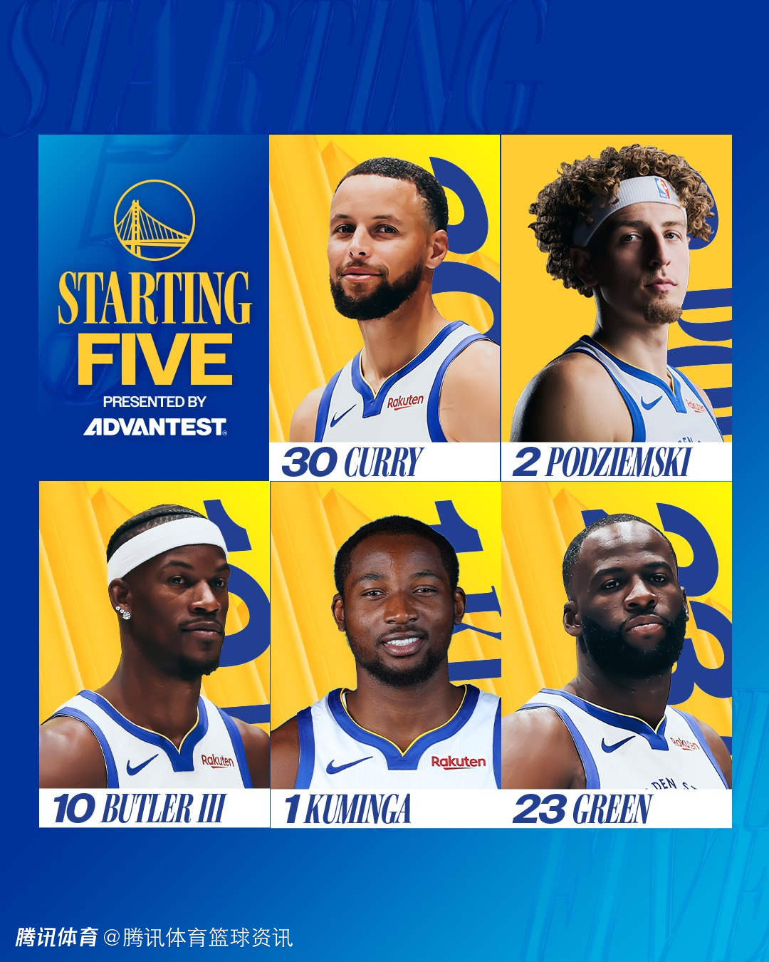 勇士队本场首发阵容名单为:库里、波杰姆斯基、巴特勒、库明加、追梦