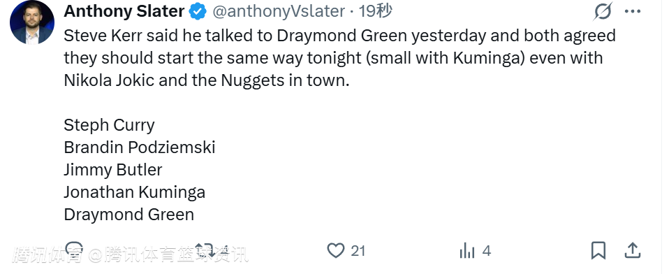 科尔表示,他昨天与追梦进行了沟通,两人一致同意,即便约基奇领衔的掘金队到访,今天球队仍将沿用此前的首发阵容,采用小个阵容,让库明加进入首发。