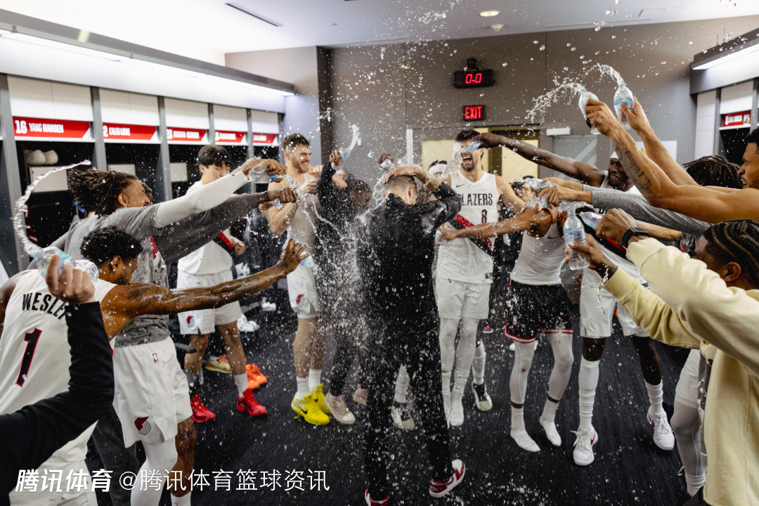 开拓者队官方推特赛后晒出了两张大家在更衣室内庆祝的照片,从照片中可以看到,球员们用泼水的方式为斯普利特庆祝生涯首胜,而中国球员杨瀚森也参与其中。