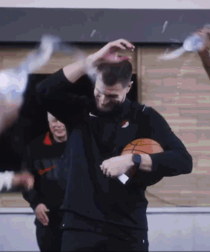 庆祝生涯首胜!开拓者球员集体向斯普利特泼水 杨瀚森也参与其中