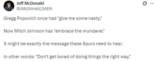 在对阵独行侠队的揭幕战中,米奇-约翰逊曾朝队员们喊出了这句口号,或许这句话不会像波波维奇的那句“给我拿出点狠劲来(Give me some nasty)。”那么出名,但这可能是马刺队如今最需要听到的忠告。约翰逊在谈到这个口号时表示:“我就是想让球队保持稳定,当时我们打得不错,我不希望比赛中的兴奋感打乱我们既定的打法。”