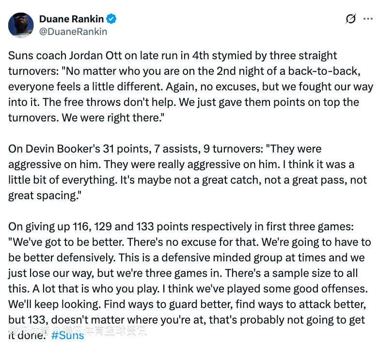 太阳主帅:布克出现9次失误因对手防守极具侵略性 丢133分很难赢球