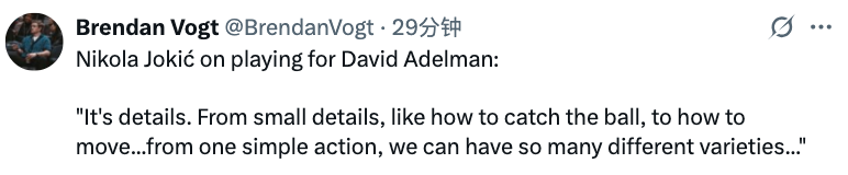 谈及主帅小阿德尔曼,约基奇直言:“(他的执教)关键在于细节。从小细节,比如如何接球、如何移动方面做起,一个简单的动作,我们可以衍生出多种不同的变化。”