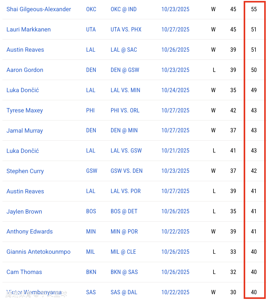 2025-10-28 16:20NBA25-26赛季常规赛首周比赛战罢,目前已经进行了53场比赛,其中出现了4名不同的球员贡献单场50+得分,12名球员合计出现15人次单场40+得分。新赛季才刚开始,似乎就要掀起疯狂的得分风暴。