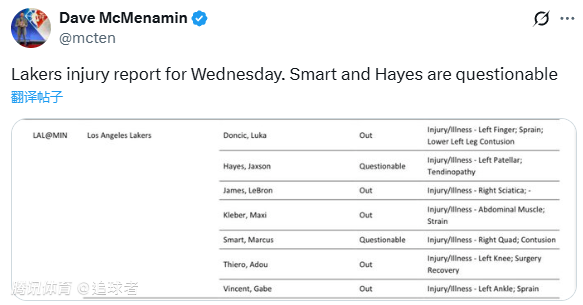湖人官方已经公布下一场对阵森林狼的伤病报告——东契奇(手指扭伤、左腿挫伤)、詹姆斯(坐骨神经痛)、克勒贝尔(腹部拉伤)、阿杜-蒂耶罗(膝盖手术恢复中)、文森特(脚踝扭伤)缺席比赛;海斯(髌腱病变)和斯马特(大腿挫伤)出战成疑,50%出战可能性。