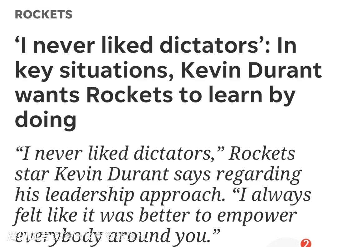 杜兰特:我从来不喜欢独断专行 火箭年轻人还在摸索角色定位