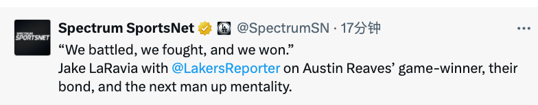 2025-10-30 13:00北京时间10月30日,NBA常规赛,靠着里夫斯的绝杀,湖人以116-115险胜森林狼,此役拉拉维亚拿到27分8篮板,赛后他接受了媒体的采访。