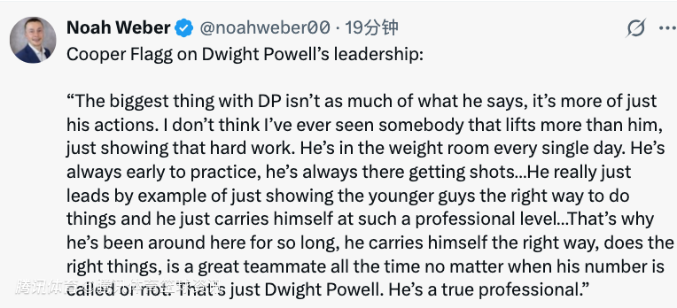 谈到德怀特-鲍威尔的领导力,弗拉格说道:“鲍威尔最关键的不是说了什么,更多是他的行动。我从没见过比他更刻苦训练的人,他用努力诠释一切。他每天都泡在力量房,训练永远早到,还总在加练投篮,他就是通过以身作则,给年轻球员示范正确的做事方式,而且始终保持着职业球员的高水准,这也是他能在队里待这么久的原因。他行事端正、做正确的事,无论是否被委以重任,都是个很棒的队友。这就是鲍威尔,一个真正的职业球员。”此役鲍威尔替补出战29分钟,拿到18分6篮板。