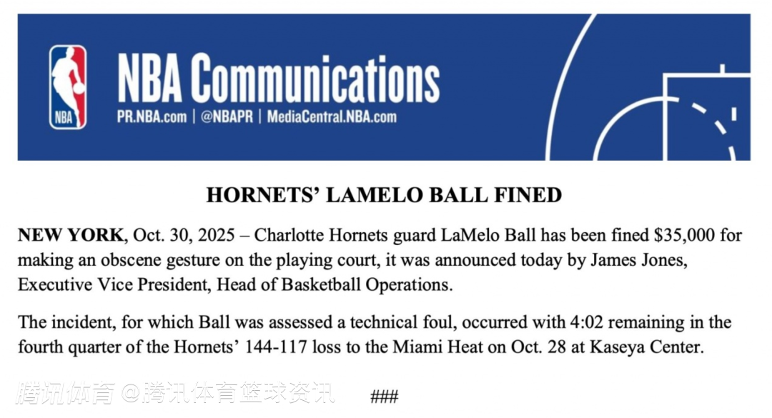 2025-10-31 00:20北京时间10月31日,NBA官方发布公告,三球在黄蜂对阵热火的比赛中朝裁判比不文明手势,被罚款3.5万美金。