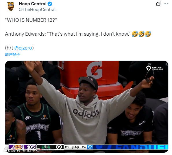 第四节镜头给到拉拉维亚,森林狼主场的球迷集体大喊:“这12号是谁?”;因伤缺阵穿着便装的爱德华兹跟着起哄,并且说道:“这也是我想问的!我也不认识。”