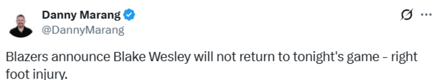 愿无大碍!开拓者官方宣布韦斯利右脚受伤 本场比赛不会回归
