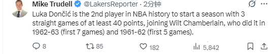 根据数据统计显示,东契奇是NBA历史上第二位在新赛季开局后连续3场比赛均得到至少40分的球员,另一位达成此成就的是张伯伦,他曾在1962-63赛季(开局前7场)和1961-62赛季(开局前5场)两次做到这一点。