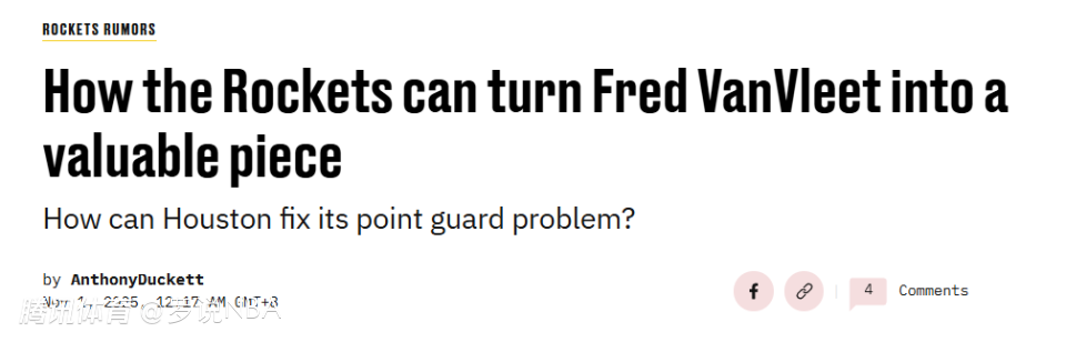 2025-11-01 19:50北京时间11月1日,休城记者Anthony Duckett撰文讨论火箭目前的短板,建议通过交易送走范弗利特,力争换来德里克-怀特来提升球队的后场实力,以下是他的观点——