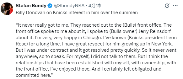 2025-11-01 20:10北京时间11月1日,公牛主帅多诺万在接受媒体采访时,谈及尼克斯今夏在选帅过程中与他传出的绯闻。
