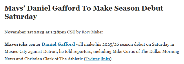 2025-11-02 06:50北京时间11月2日,达拉斯独行侠队中锋加福德在接受采访时向记者透露,他将在墨西哥城对阵活塞队的比赛中,迎来自己 2025-26赛季的首秀。