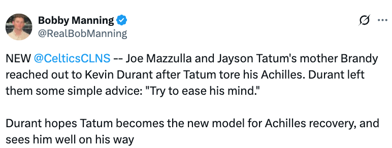 康复标杆!杜兰特:塔图姆跟腱受伤后他母亲和马祖拉都打电话来咨询我