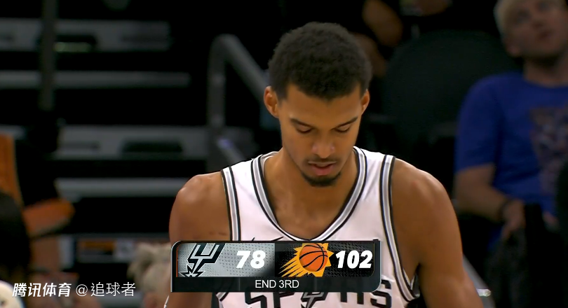 第三节马刺继续被太阳按着摩擦,文班亚马在场上仍旧低迷,扬手要球打到布克的颈部并且吃到进攻犯规,之后持球突破再次失误,两次出手都打铁不中,三节打完马刺78-102落后到24分,期间一度落后到31分;节间休息时,文班亚马满脸的沮丧和无奈。