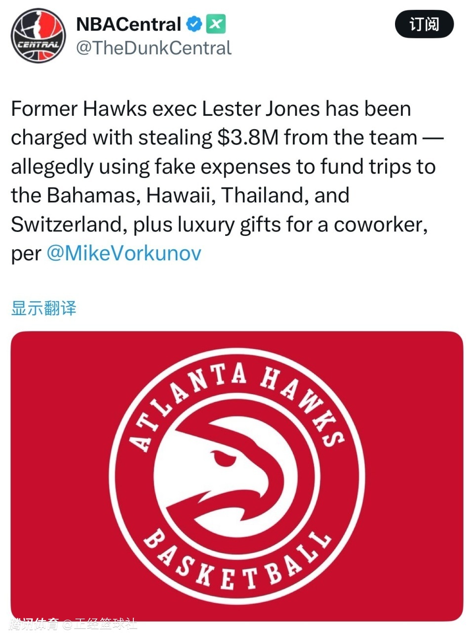 NBA再曝丑闻:老鹰高管被指控挪用380万公款 利用职务打造奢靡生活