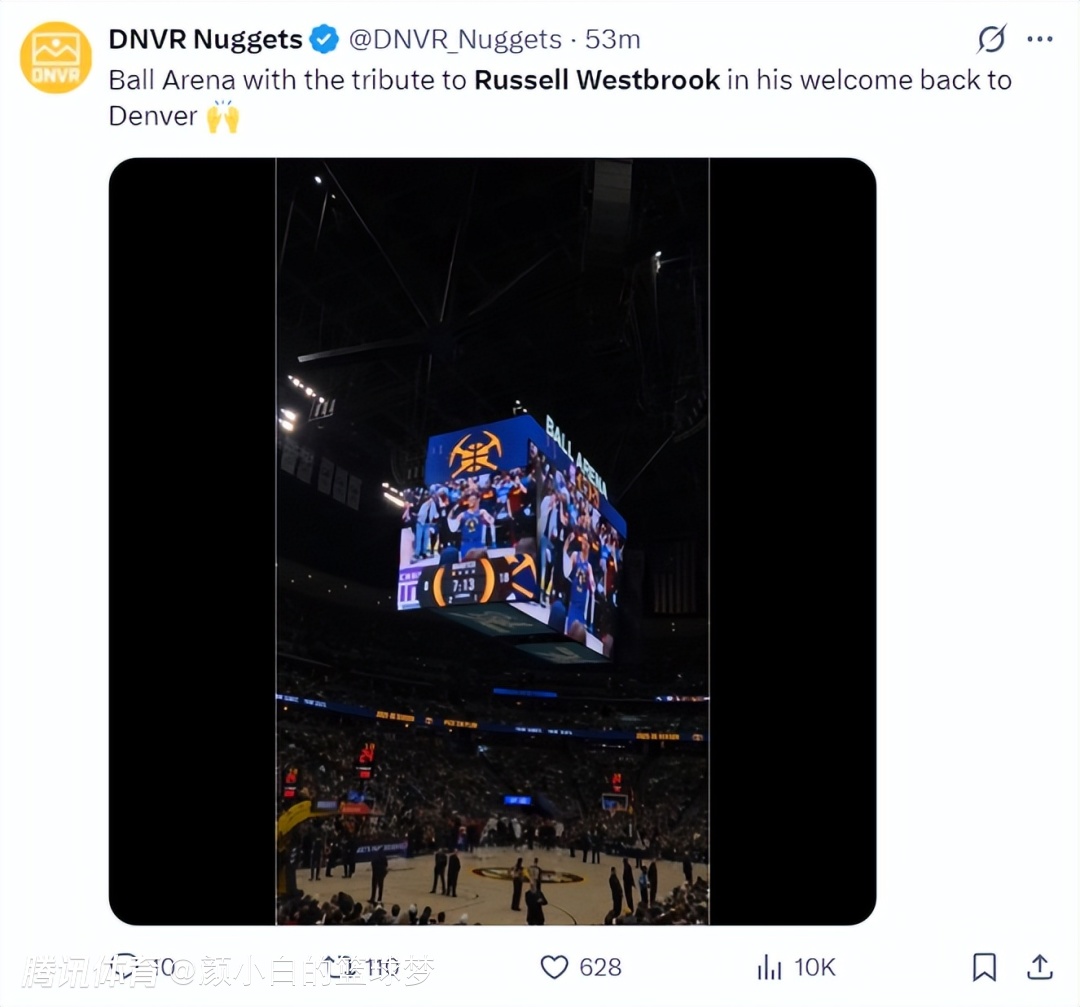 掘金官方也为少爷制作了致敬的视频,全场的球迷也在为少爷欢呼,首节威少5中2+三分2中1拿到5分2篮板1助攻,克里斯蒂这个安排也是为了让威少获得丹佛高原球迷的欢呼。
