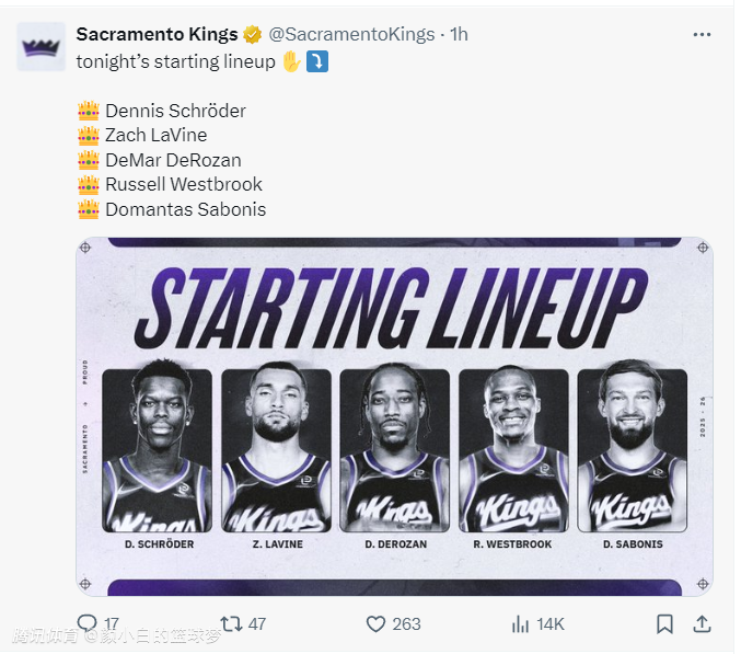 这场比赛克里斯蒂再度让威少先发,但拿着363万底薪的威少以1.91米的身高打先发的四号位,施罗德、拉文、德罗赞、威少、小萨博尼斯,没错德罗赞是三号位,威少是四号位。