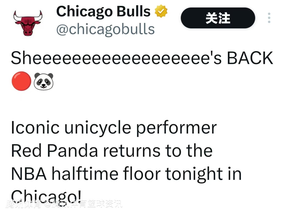 2025-11-05 09:00北京时间11月5日,NBA常规赛继续进行,公牛对阵76人。赛前,公牛官方账号公布一条令人振奋的消息,此前在表演中受伤的传奇独轮车表演者“红熊猫”今天将重返NBA赛场,在芝加哥上演中场秀。视频中,“红熊猫”身着名宿乔丹的45号球衣向大家打招呼,公牛官方模仿乔丹复出时的文案,配文写道:“她回来了!”