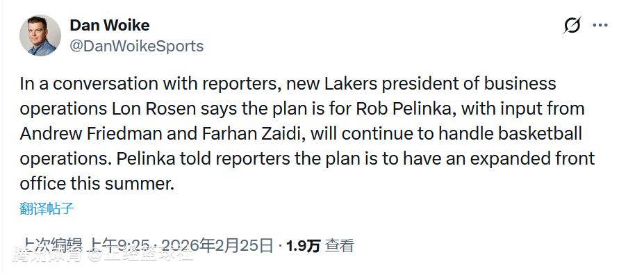 2026-02-25 10:00北京时间2月25日,NBA常规赛继续进行。根据湖人队记者Dan Woike的报道称,湖人队总经理佩林卡确定不会下课,他将继续负责球队的运营工作,而且今年夏天将扩大球队管理层的规模。