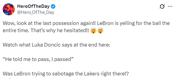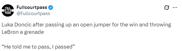 美媒解读了詹姆斯错失三分绝杀后东契奇的唇语,东契奇疑似说道:他(勒布朗)让我传球,我就传了。