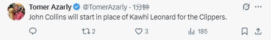 2026-03-17 08:50北京时间3月17日,NBA常规赛继续进行,快船队对阵马刺队。赛前,快船队官方宣布,莱昂纳德将因伤缺席本场比赛,而约翰-科林斯将顶替他进入首发阵容。