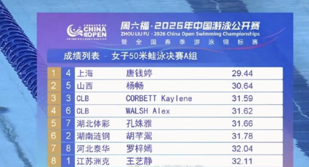 上午的预赛中,唐钱婷就已展现出极佳状态。她在第四组第四道出发后一骑绝尘,29秒49的成绩打破了自己在2024年多哈游泳世锦赛上创造的29秒51的亚洲纪录,以预赛第一晋级。这也是2026年中国泳坛诞生的首个亚洲纪录。