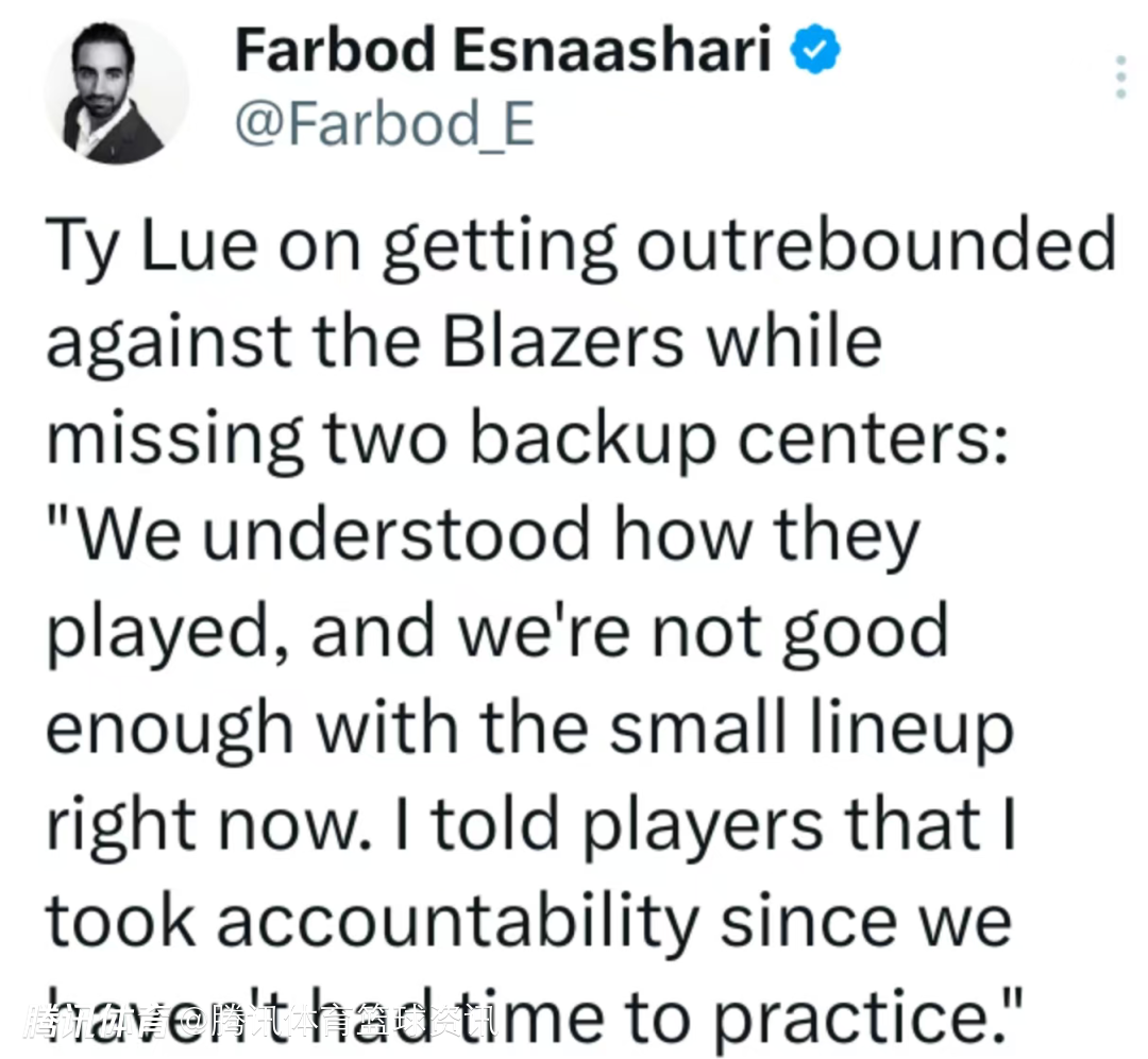 泰伦-卢谈到球队在两名替补中锋缺阵、对阵开拓者时篮板被爆的情况:“我们清楚他们的打法,而我们目前的小个阵容实力还不够。我跟球员们说了,这责任在我,因为我们一直没有时间进行合练。”