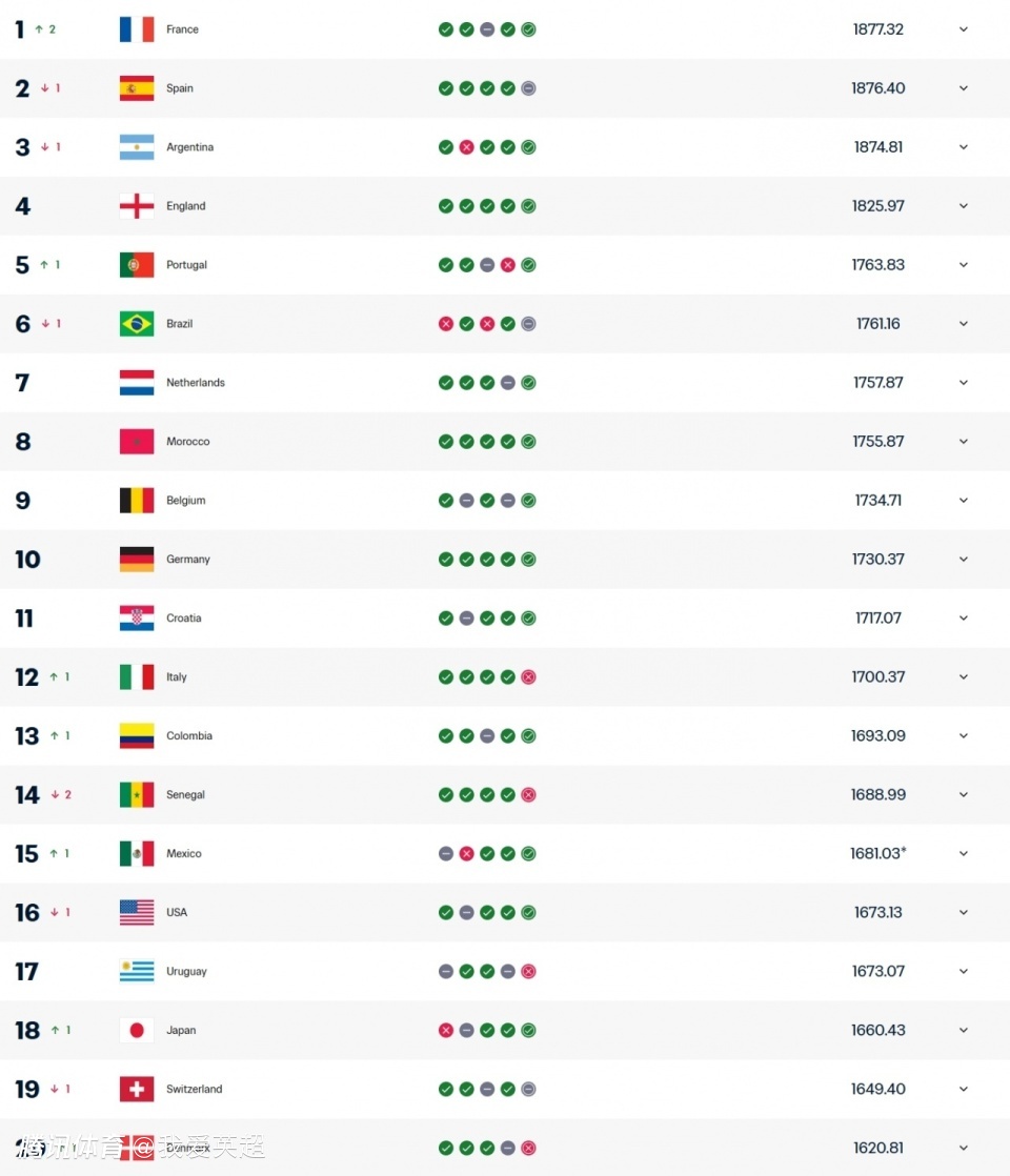 FIFA最新排名:法国超越西班牙登顶!意大利升第12,国足跌至第94位