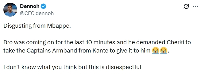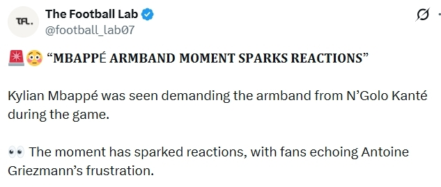“现在我终于明白格列兹曼退出国家队的那种挫败感了。”;“姆巴佩这行为真令人不适,我不知道你们怎么想的,但这很不尊重人。”;“太老实也不是好事,想象一下,35岁的坎特在球场中央被27岁的姆巴佩夺走队长袖标。换做是其他球员,姆巴佩和谢尔基可不敢。”