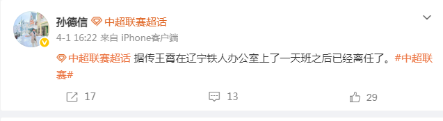 来也匆匆去也匆匆?网曝王霄担任辽宁铁人俱乐部副总仅一天就已离任
