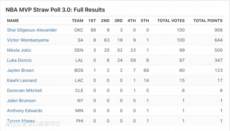 本次投票邀请了100位来自地方、全国及国际媒体的成员参与,完全复刻了NBA赛季末官方奖项的投票流程与计分规则:每张五人选票中,第一名计10分、第二名7分、第三名5分、第四名3分、第五名1分。