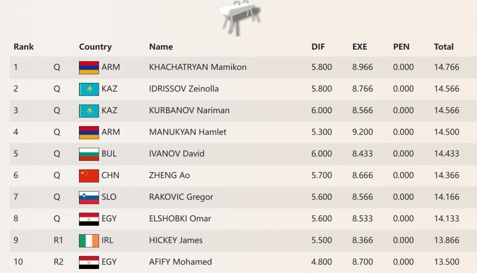 去年世锦赛上有不俗表现的亚美尼亚新秀哈恰特杨发挥稳健,难度5.8中规中矩,14.766力压群雄。包括巴黎奥运银牌库尔巴诺夫在内的两位哈萨克斯坦选手都拿到14.566分。