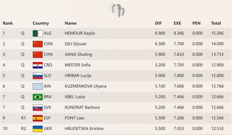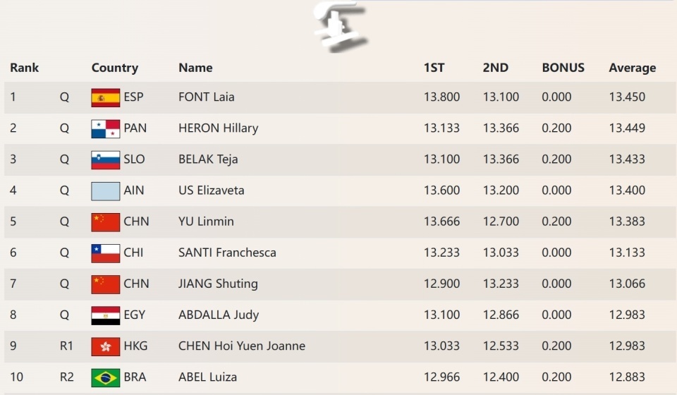 中国选手李鸿颜难度只有5.2,以13.733排在第七。