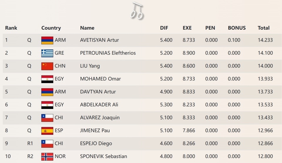 另一位亚美尼亚新秀马努克扬虽然难度只有5.3,但完成高达9.2,以14.50排名第四;中国选手郑奥以14.366排名第七。