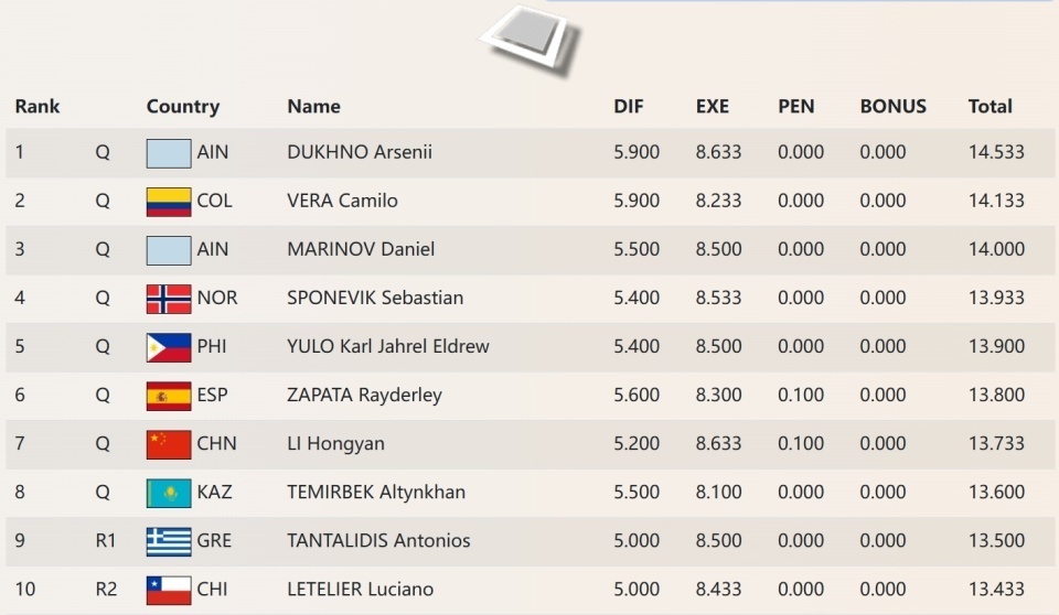 去年世青赛发挥出色的中立运动员杜霍诺,进入成年组的表现也很抢眼,5.9的难度拿到14.533排在第一;他的队友马利诺夫以14.00位列第三。