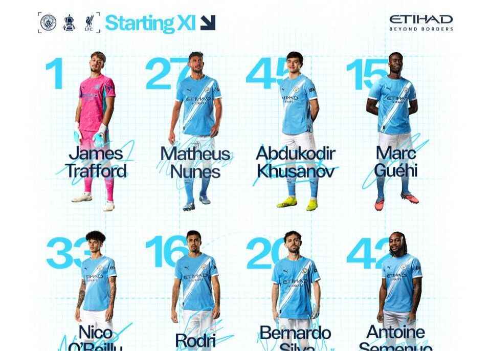 曼城首发阵容:1-特拉福德、15-格伊、27-努内斯、33-奥赖利、45-胡桑诺夫、20-B席、16-罗德里、42-塞梅尼奥、11-多库、10-谢尔基、9-哈兰德