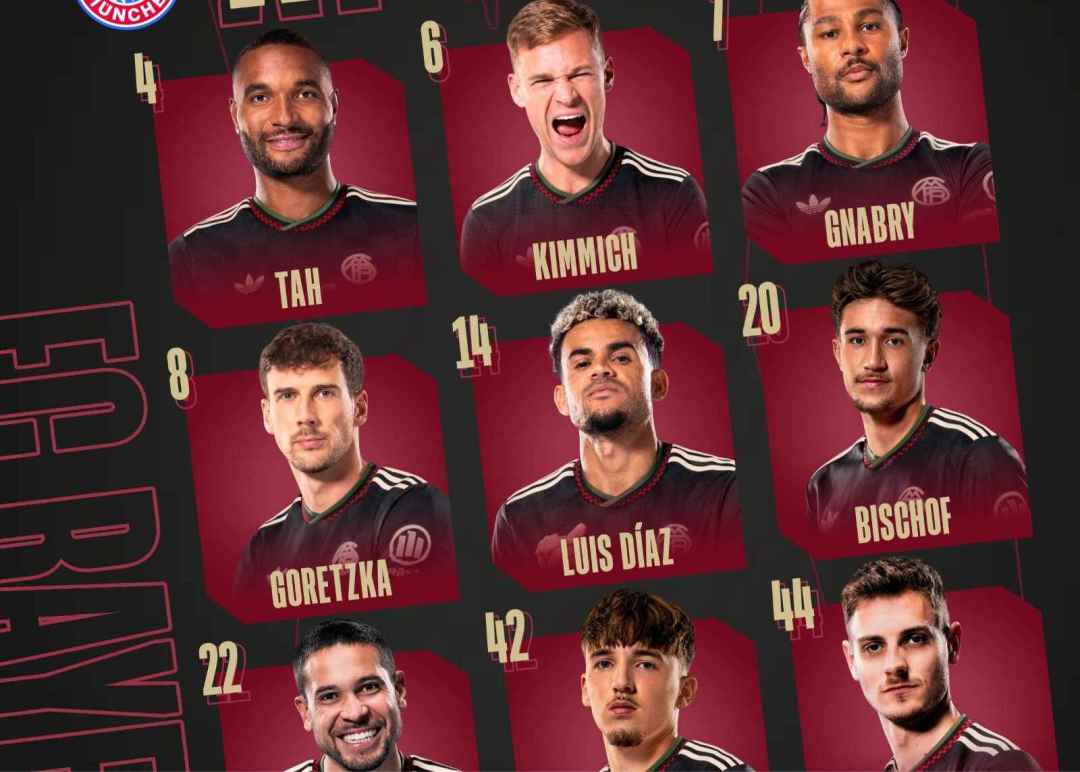 替补:40-乌尔比希、2-于帕梅卡诺、10-穆西亚拉、17-奥利塞、19-阿方索·戴维斯、21-伊藤洋辉、27-莱默、45-帕夫洛维奇、49-卡多佐